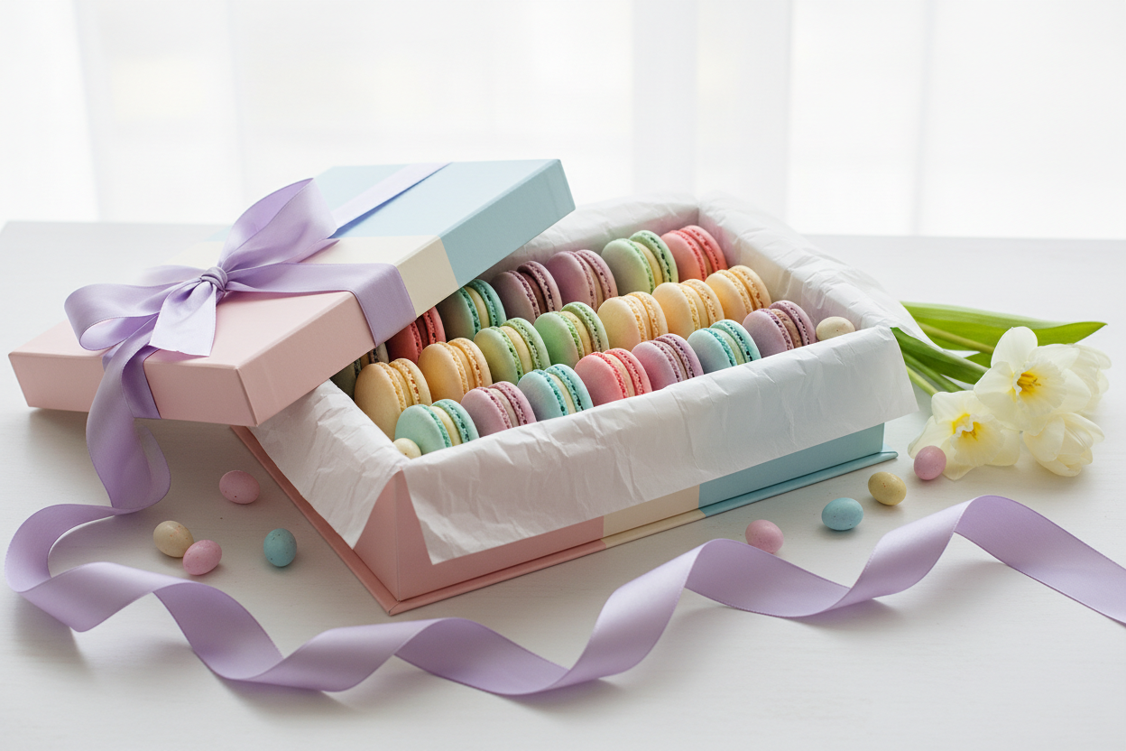 Discover our limited-edition pastel macaron collections, beautifully presented as the perfect Easter gift. Pre-order now to secure your celebration.